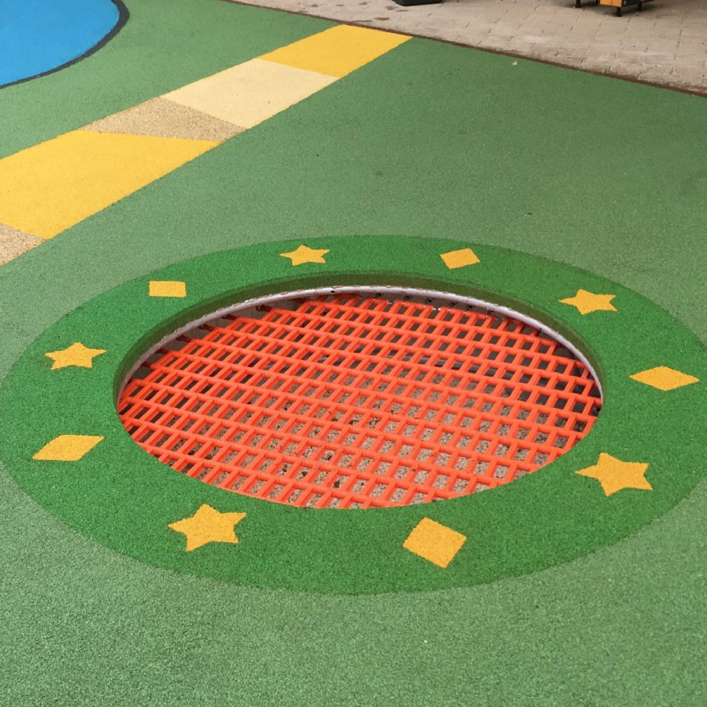 Trampoline de forme ronde destiné à être utilisé sur des aires de jeux à usage intensif. Le tapis de saut est composé de lamelles très résistantes d'une largeur de min. 37 mm, ayant la forme de la lettre "V" et renforcé par des nervures. Grâce à la forme unique des lamelles, les espaces entre les éléments du tapis ont été réduits à seulement 7 mm, ce qui empêche les petits objets, tels que les clés ou les téléphones portables, de tomber dans le trampoline. Le tapis est disponible en 8 coloris, il est également possible de faire des graphismes sur le tapis. Le collier de trampoline en caoutchouc est disponible en 2 couleurs standard et 23 couleurs spéciales. De plus, un motif décoratif peut être réalisé sur le col. Le trampoline peut être équipé d'un couvercle ouvrant qui facilite le nettoyage à l'intérieur.