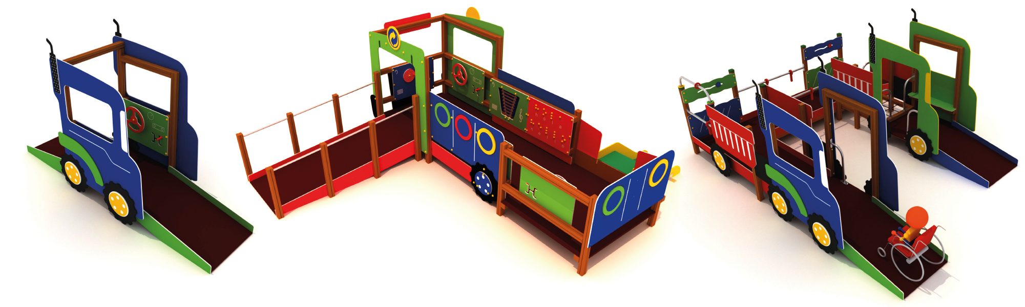 Conducteurs de camions de pompier, camions bennes ou trains vous allez aimer ces créations dédiées aux enfants en fauteuil roulant ou PMR. Ces ensembles très colorés avec leur passerelle d’accès vous permettront de jouer avec tous les autres enfants qui disposent d’un petit toboggan pour descendre.