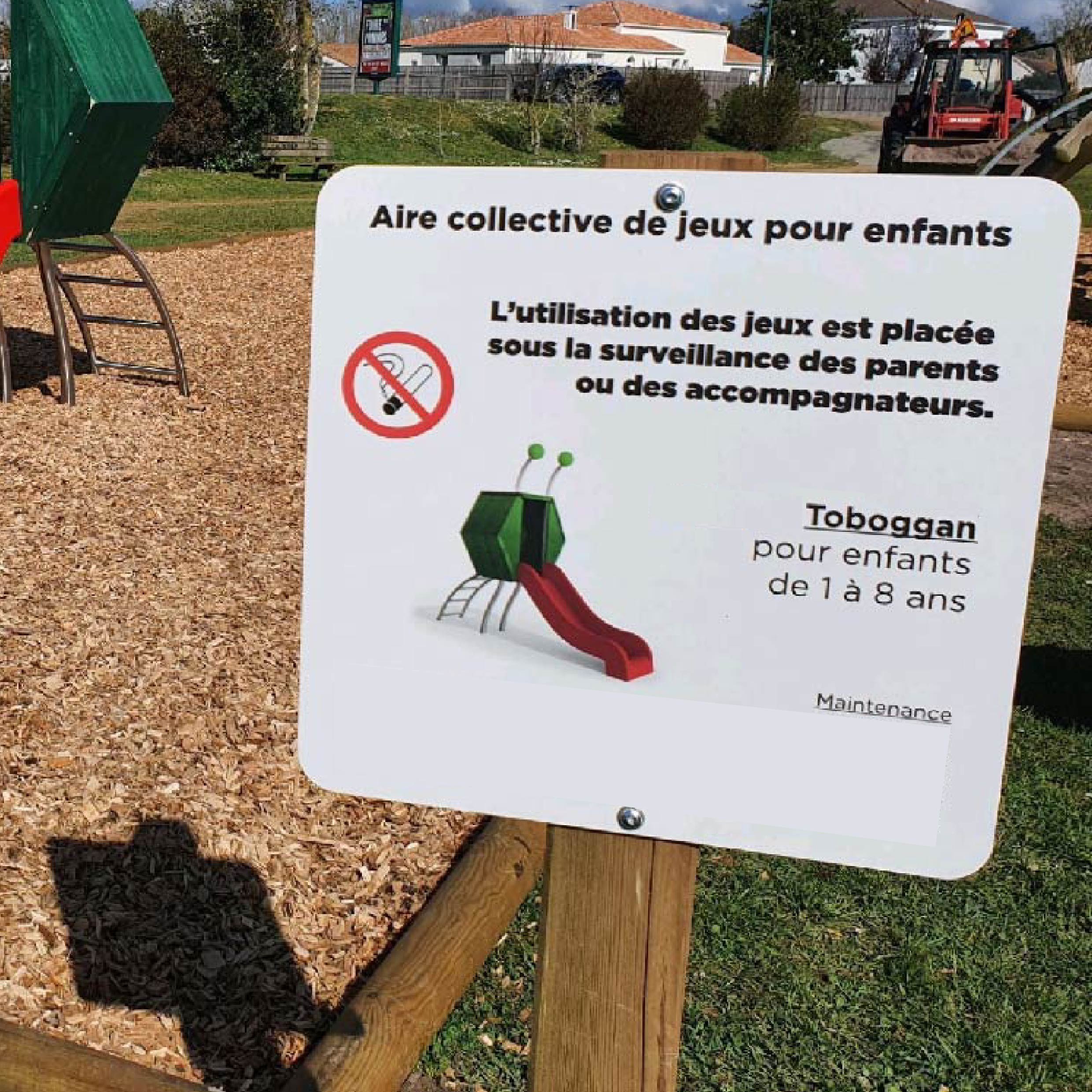 Support de communication, ce panneau est obligatoire sur une aire de jeux et nécessaire sur un équipement sportif pour indiquer les consignes relatives à chaque équipement. Il doit comporter un certain nombre d’informations relatives aux consignes d’usages, aux risques de brûlures avec des surfaces en acier et autres informations relatives à la maintenance.