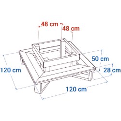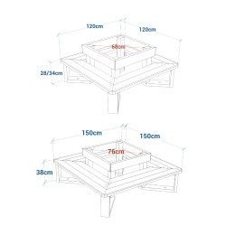 Dimensions hors tout 120x120 cm, hauteur 50 cm - Hauteur d’assise 28 cm / 34 cm