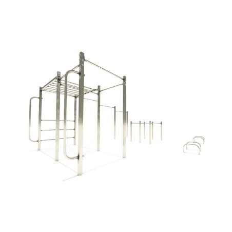 Module d'entraînement de cross-training et de street workout dans une aire de fitness outdoor. Cette combinaison de street workout offre plusieurs postes d'entraînement différents pour varier les exercices et solliciter l'ensemble de sa musculature !