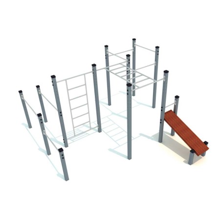 Cette combinaison comprend : 2 barres fixes, 2 barres parallèles, d'une échelle horizontale en "S", de 2 barres de traction, d'un espalier et d'un banc incliné de musculation.