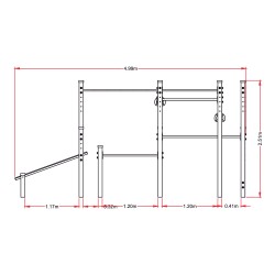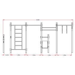 Cette combinaison comprend : 2 barres fixes différentes hauteurs, 1 barre parallèle, d'une échelle horizontale, de 2 barres de traction, de 2 espaliers, de poignées de traction et d'un banc incliné de musculation.