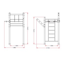 Cette combinaison comprend : 2 barres fixes, 2 barres parallèles, d'une échelle horizontale en "S", de 2 barres de traction, d'un espalier et d'un banc incliné de musculation.