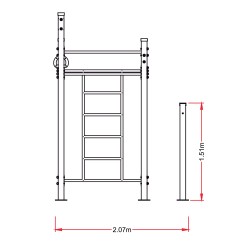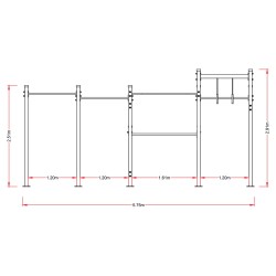 Cette combinaison comprend : des barres fixes de différentes hauteurs, de barres de traction, d'un espalier, d'une échelle horizontale, de poignées de traction et de 2 barres parallèles.