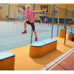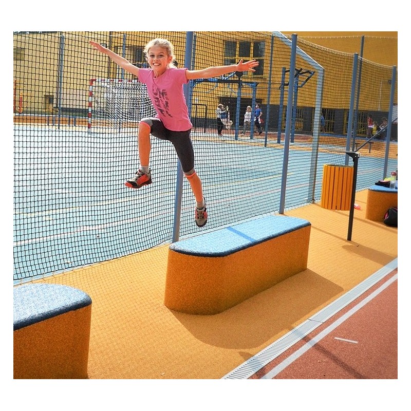 Construction très résistante qui peut résister même dans les espaces publics (solution ANTIVANDAL). Le cœur de l'élément est composé d'un mélange de granulés SBR, de polystyrène et de liant polyuréthane. La couche extérieure est composée de granulés EPDM de couleur unie.