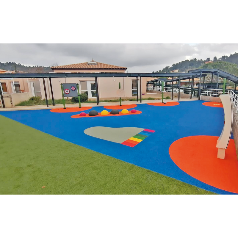 Structure demi-sphérique composée d'une couche de 4cm de EPDM et d'un remplissage en SBR. Module à implanter dans un sol amortissant EPDM sur un support en béton par un scellement chimique du tube en acier
