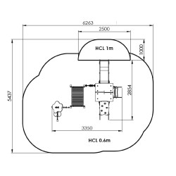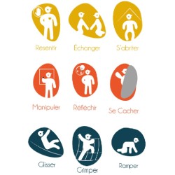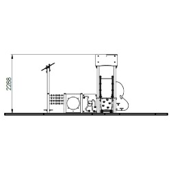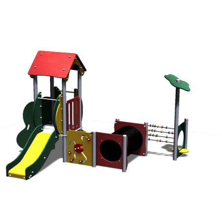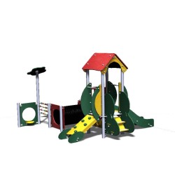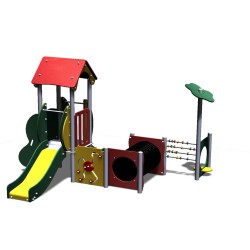 Ensemble composé d'une tour avec un toboggan glissière en PEHD, d'un escalier, d'un plan de grimpe incliné, de 2 panneaux de manipulation,