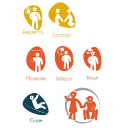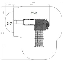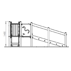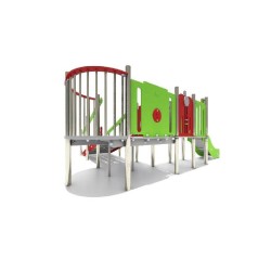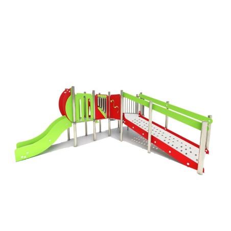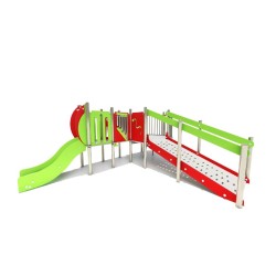 Ensemble composé d'une double tour avec un toboggan glissière en PEHD, d'une rampe inclinée pour un accès possible en fauteuil roulant,