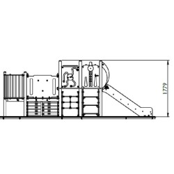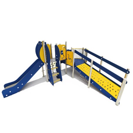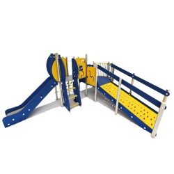 Ensemble composé d'une double tour sans toit avec un toboggan glissière en INOX, d'une rampe inclinée pour un accès possible en fauteuil roulant,
