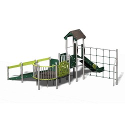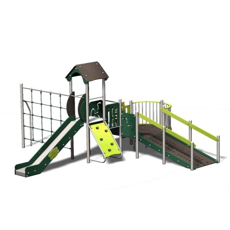 Ensemble composé d'une double tour en escalier donnant accès à un toboggan glissière en PEHD, d'une rampe inclinée pour un accès possible en fauteuil roulant,
