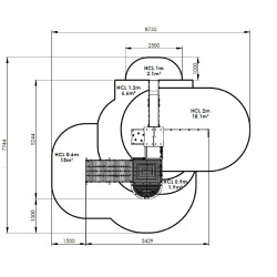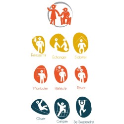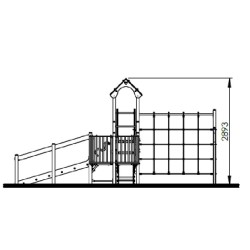 d'un balcon, de 3 panneaux de manipulation, d'un filet de grimpe et d'un pan incliné avec prises de grimpe.