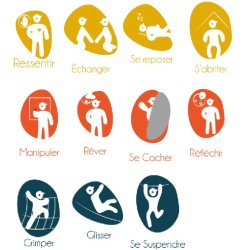 d'un mur d’escalade en cordage armé, d'un panneau d'escalade avec prise de grimpe et d'une maisonnette.
