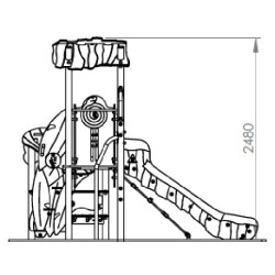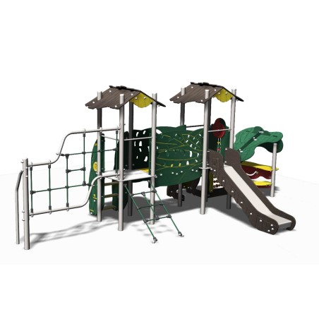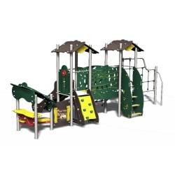 Ensemble composé de 2 tours relié par une passerelle rigide avec 1 toboggan à glissière en Inox, d'un escalier, de 3 panneaux de manipulation, d'un filet incliné,