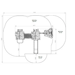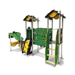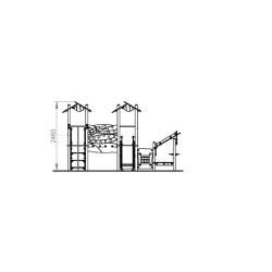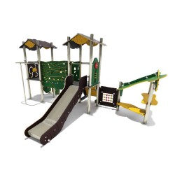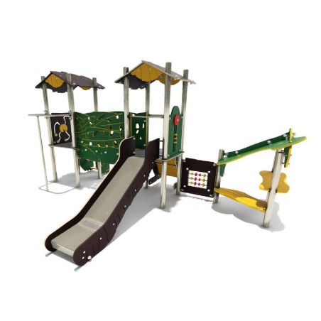 Ensemble composé de 2 tours reliées par une passerelle rigide avec 1 toboggan à glissière en Inox, d'un escalier, de 3 panneaux de manipulation, d'un filet incliné,