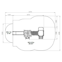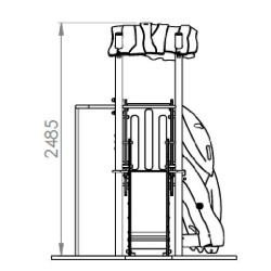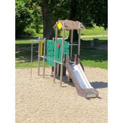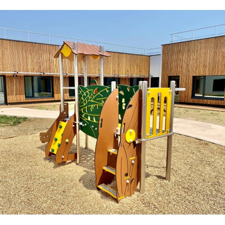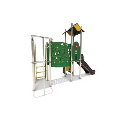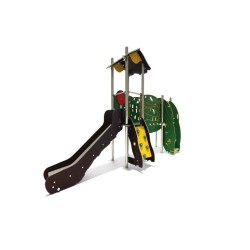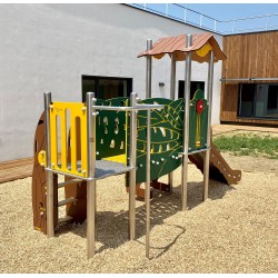 Ensemble composé de 2 tours dont 1 avec un toit reliées par une passerelle rigide avec 1 toboggan à glissière en Inox, d'un escalier, d'1 panneau de manipulation, d'un escalier,