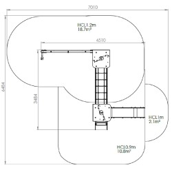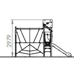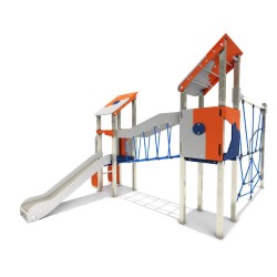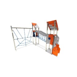 Ensemble composé de 2 tours de 2 hauteurs différentes reliées par un pont de corde incliné avec un toboggan glissière en Inox, d'un escalier,