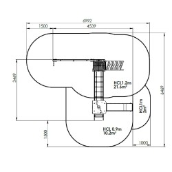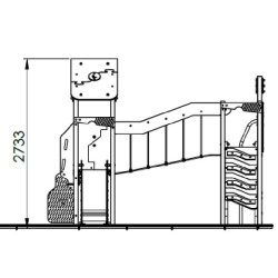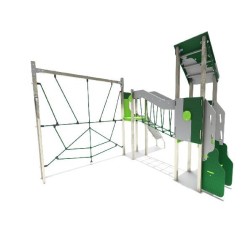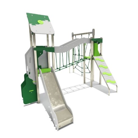 Ensemble composé de 2 tours de 2 hauteurs différentes reliées par un pont de corde incliné avec un toboggan glissière en Inox,