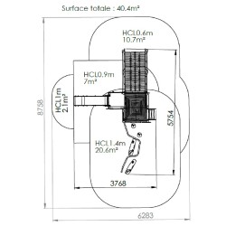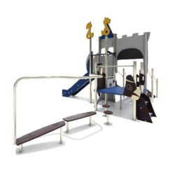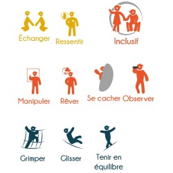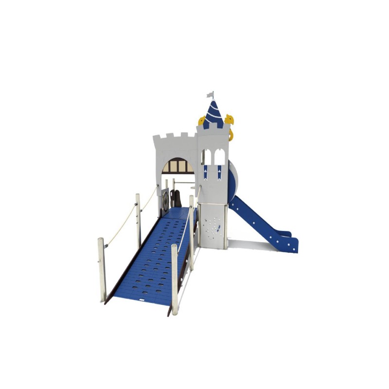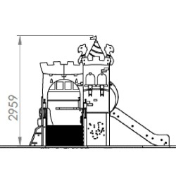 La tour dispose d'un toboggan inox accessible aussi par un escalier et dispose d'un mur d'escalade, d'un module d'équilibre et des pas japonais,