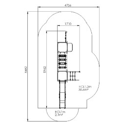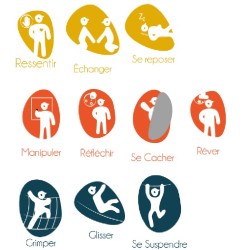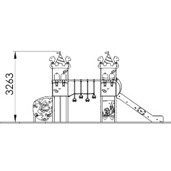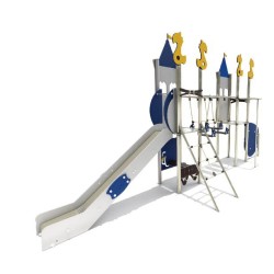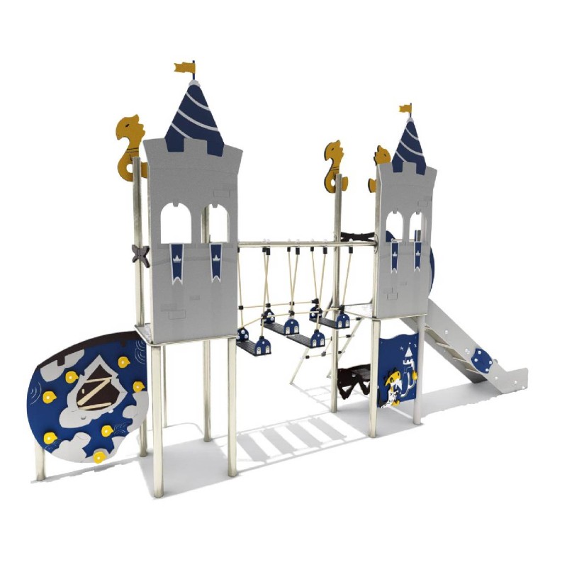 Ensemble composé de 2 tours reliées par un pont de corde mobile, d'un mât de pompier, d'un panneau d'escalade avec prise de grimpe vertical,
