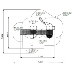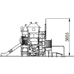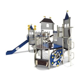 La structure dispose également de 2 plateformes dont 1 avec un balcon, d'un escalier, d'un toboggan inox, d'un mât de pompier,