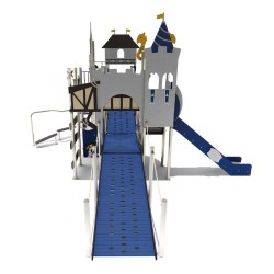 Grande structure de jeux composé de nombreuses tours sur 4 hauteurs différentes accessibles par 2 larges rampes accessibles par des fauteuils roulants.