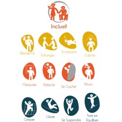 d'un panneau d'escalade vertical avec prises de grimpe, d'une zone d'assise, d'une cloche, d'un kiosque et de 4 panneaux de manipulation.