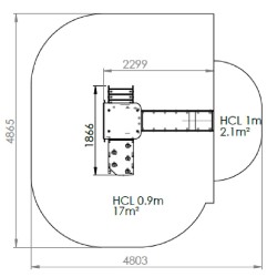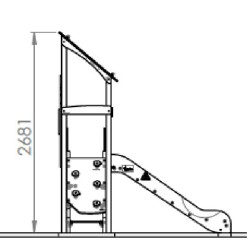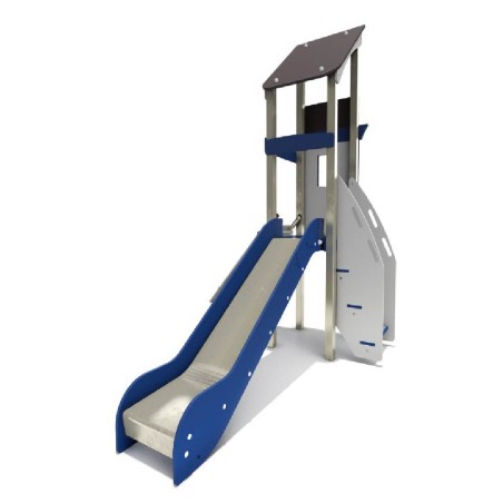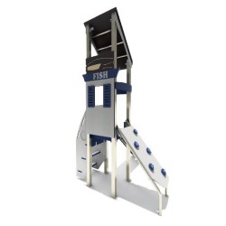Ensemble composé d'1 tour avec une structure porteuse en inox, d'un escalier, d'un toboggan à glissières en PEHD et d'1 panneau d'escalade incliné avec prises de grimpe..