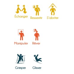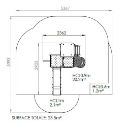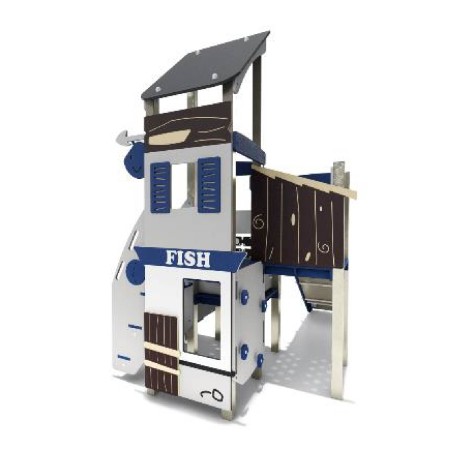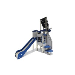 d'un toboggan à glissières en inox, d'un mât de pompier, de 2 murs d'escalade vertical et d'un panneau de manipulation.