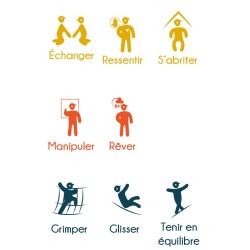 de pas de berger, d'1 panneau d'escalade vertical avec prises de grimpe et un panneau de manipulation.
