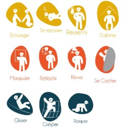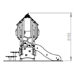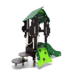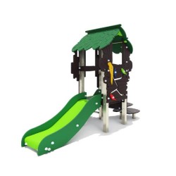 Ensemble composé d'une tour avec 1 toboggan à glissières en PEHD, d'un escalier en pas japonais, d'un panneau d'escalade incliné avec des prises de grimpe