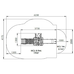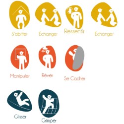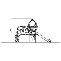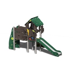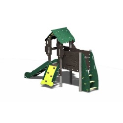 Ensemble composé d'une tour avec 1 toboggan à glissières en PEHD, d'un escalier, d'une passerelle rigide, d'un panneau d'escalade incliné avec des prises de grimpe