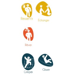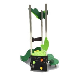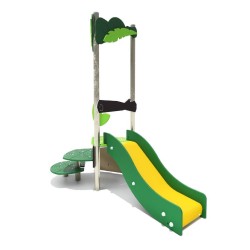 Ensemble composé d'une tour avec 1 toboggan à glissières en PEHD, d'un escalier en pas japonais et d'un panneau d'escalade avec des prises de grimpe