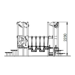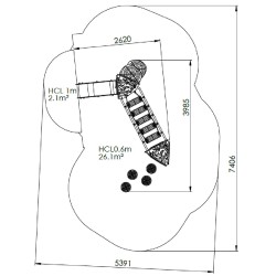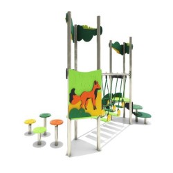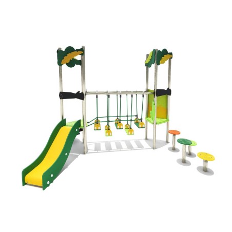 Ensemble composé de 2 tours avec 1 toboggan à glissières en PEHD, d'un escalier en pas japonais, d'un pont de corde mobile et de plusieurs plots plateformes.