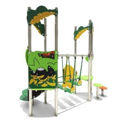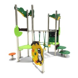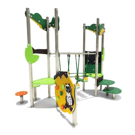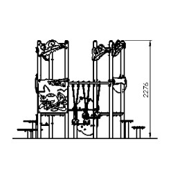 Ensemble composé de 2 tours avec 1 toboggan à glissières en PEHD, d'un escalier en pas japonais, d'un pont de corde mobile