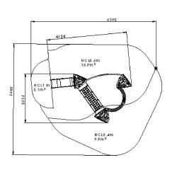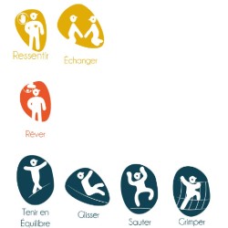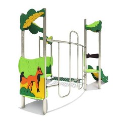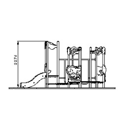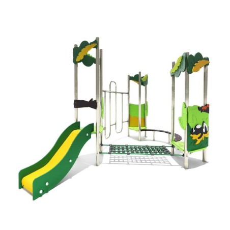 Ensemble composé de 3 tours reliées par une poutre d'équilibre, un mur de grimpe et un filet horizontal pour rejoindre la tour avec 1 toboggan à glissières en PEHD.