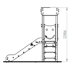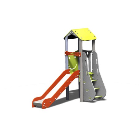 Ensemble composé d'une tour avec un toboggan glissière en PEHD, d'un escalier et un panneau de manipulation.