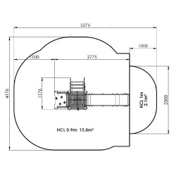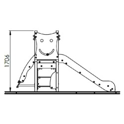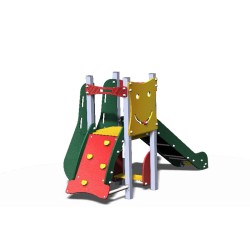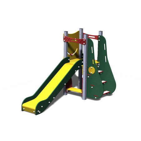 Ensemble composé d'une tour avec un toboggan glissière en PEHD, d'un escalier, d'un panneau d'escalade avec prises de grimpe et un panneau de manipulation.
