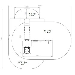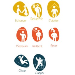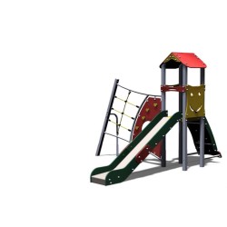 et d'un ensemble de grimpe pour parcours latérale avec un panneau avec des prises de grimpe et un filet en corde armé.