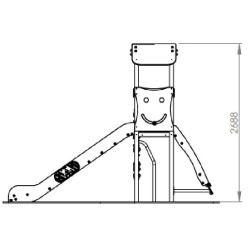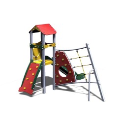 Ensemble composé d'une tour avec un toboggan glissière Inox, d'un panneau d'escalade avec prises de grimpe, d'un panneau de manipulation