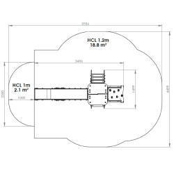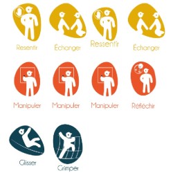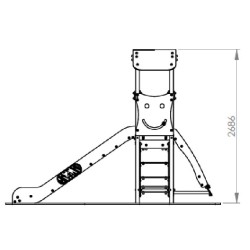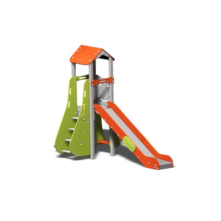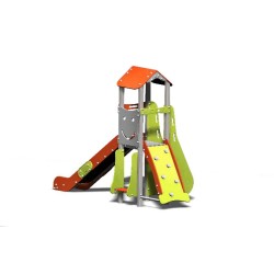 Ensemble composé d'une tour avec un toboggan glissière Inox, d'un escalier, d'un panneau d'escalade avec prises de grimpe, d'un panneau de manipulation