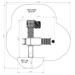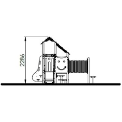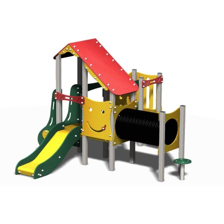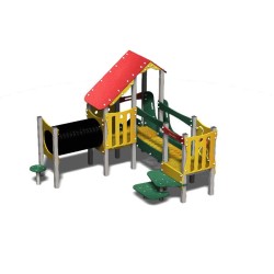 Ensemble composé de 3 tours dont 2 juxtaposées reliées par une passerelle rigide avec un toboggan glissière en PEHD, d'un escalier, de 2 panneaux de manipulation