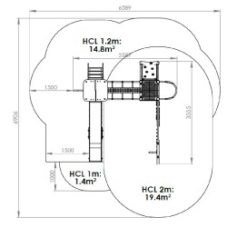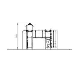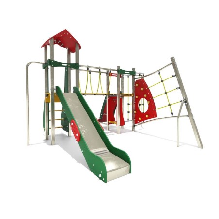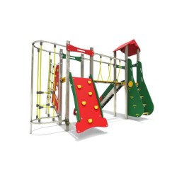 Ensemble composé de 2 tours avec un toboggan glissière Inox reliées par un pont de corde, d'un escalier, d'un panneau incliné avec prises de grimpe,