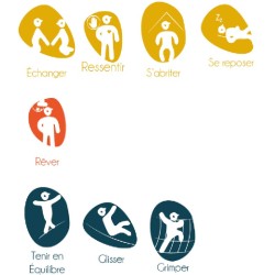d'une zone d'assises et d'un ensemble de grimpe vertical avec un panneau avec prises de grimpe et un filet en cordage armé.