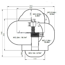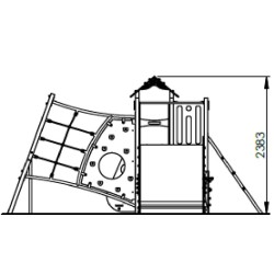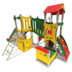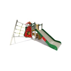 Ensemble composé de 2 tours sur 2 hauteurs de plateformes avec 1 toboggan large à glissières en Inox reliées par une passerelle rigide, d'un escalier, d'un panneau incliné avec prises de grimpe,