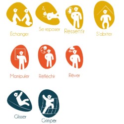 d'une zone d'assis, d'un kiosque, de 4 panneaux de manipulation et d'un ensemble de grimpe pour parcours latérale avec un panneau avec des prises de grimpe