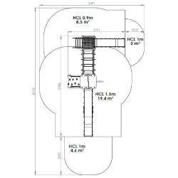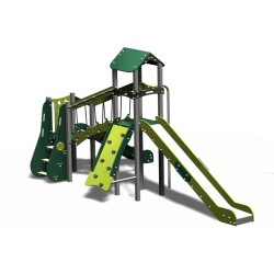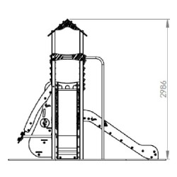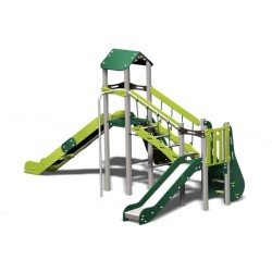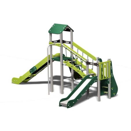 Ensemble composé de 2 tours sur 2 hauteurs de plateformes avec 2 toboggans à glissières en Inox reliées par un escalier mobile, d'un escalier,