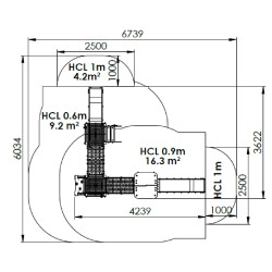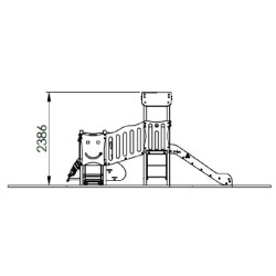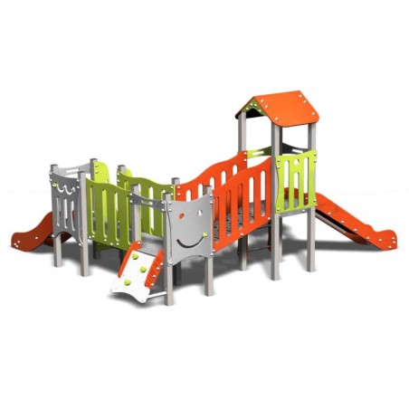Ensemble composé de 3 tours sur 2 hauteurs de plateformes avec 2 toboggans à glissières en Inox et en PEHD reliées par une passerelle rigide, d'un escalier,