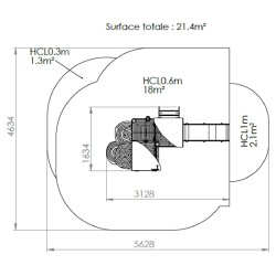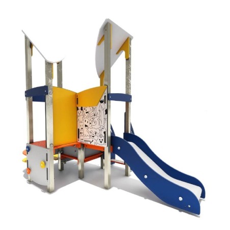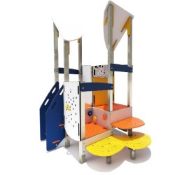 Ensemble composé de 3 tours juxtaposée avec 2 hauteurs de plateformes avec un toboggan glissière en PEHD, d'un escalier, de pas japonais en escalier,