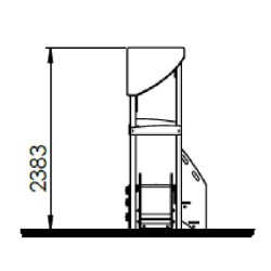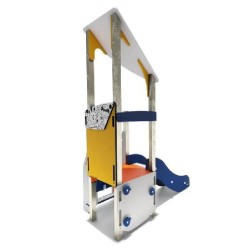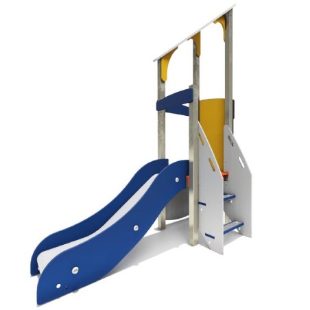 Ensemble composé d'une tour avec un toboggan glissière en PEHD, d'un escalier et d'un panneau d'escalade vertical avec prise de grimpe.